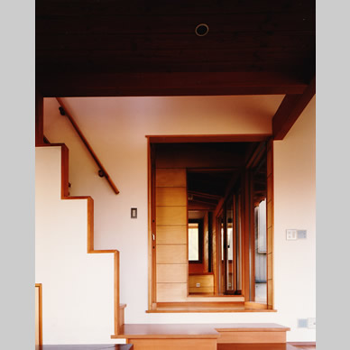 建物は、八ヶ岳連峰の山並みと歩調を合わせるかの様な片流れの屋根をもった3つの棟(ステージ)と、それらを繋ぐデッキスペースから成り立っている。デッキスペースは、東西に抜ける3棟の隙間スペースと、南北に抜ける廊下と、2棟間の懐スペースで構成されている。これらの外部と内部を繋ぐ中間スペースは、視線の軸となり、風の通り道となり、全体として一体感を生み出す役割を果たしている。建物に入り込んだデッキスペースをガラリ戸で仕切れば、目隠しだけでなく防犯や雪除けなどにも利用することが出来る。