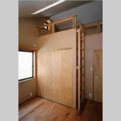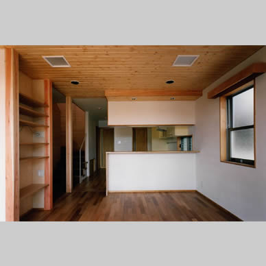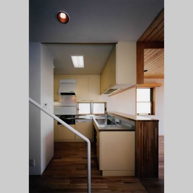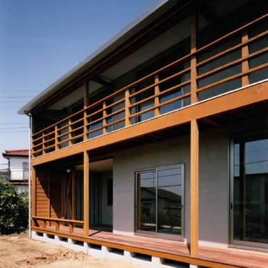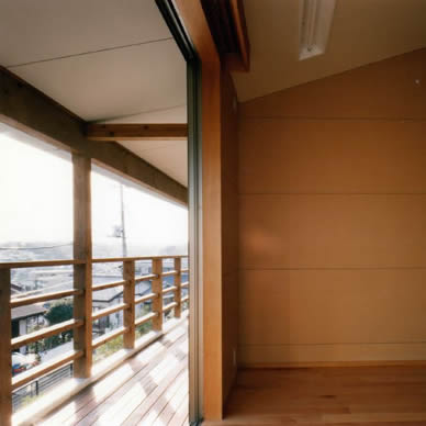 南斜面の丘の上に建つ住宅である。アレルギーをもった子供がいることから、健康住宅を目指した。日射については、南面全面に奥行のあるバルコニーをとり、屋根は低めの深い庇をとり、西面には開口部を設けず日除けの壁を増設して対応した。また斜面下から吹き上げてくる風を見越して、片流れの屋根を南に向け北面にハイサイドライトを設けることで、風の道を確保した。断熱については外壁通気工法や断熱サッシを採用した。仕上げの素材についても、木を中心として白色珪藻土、月桃紙、自然塗料など出来る限りの配慮をした。